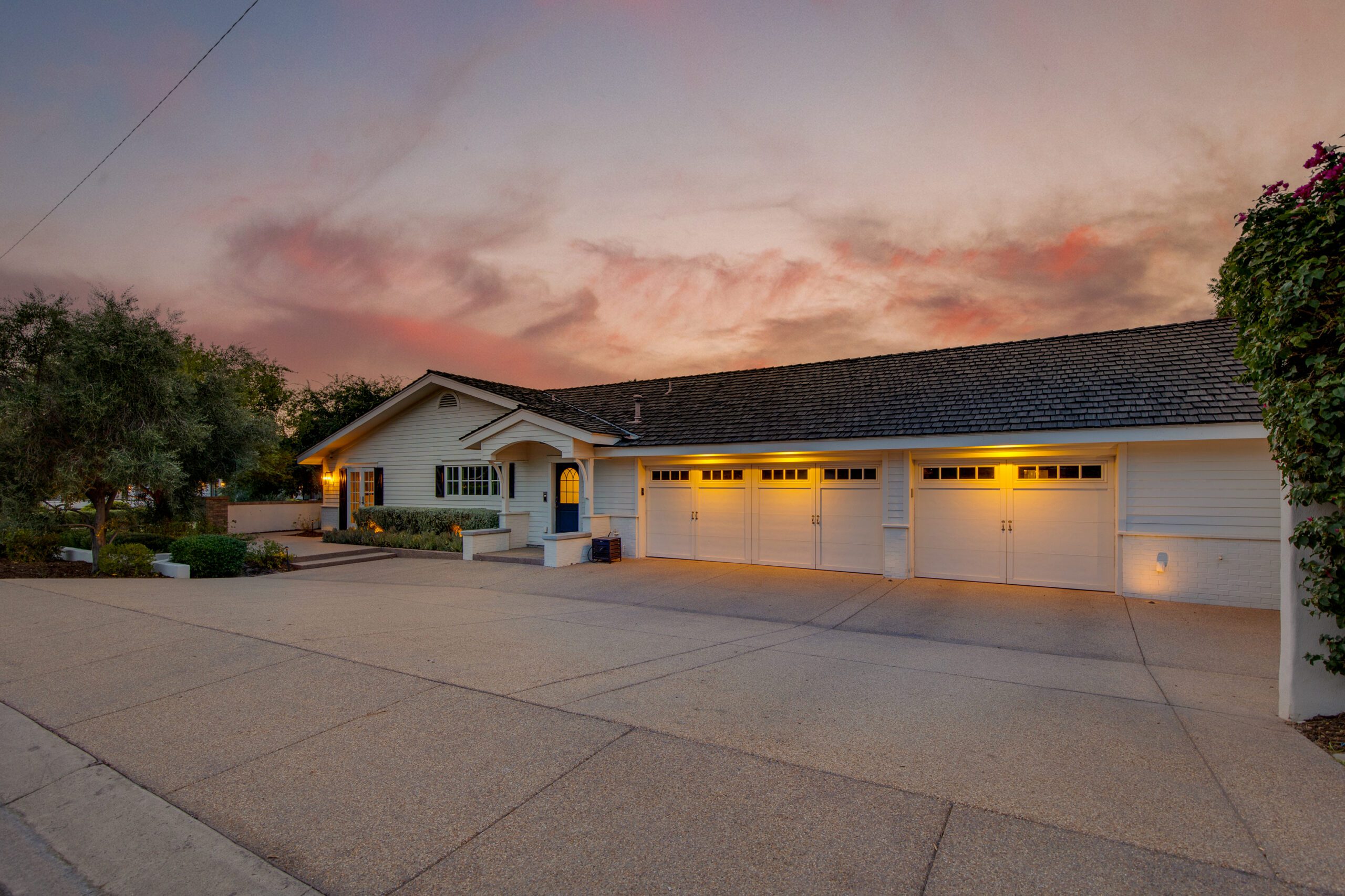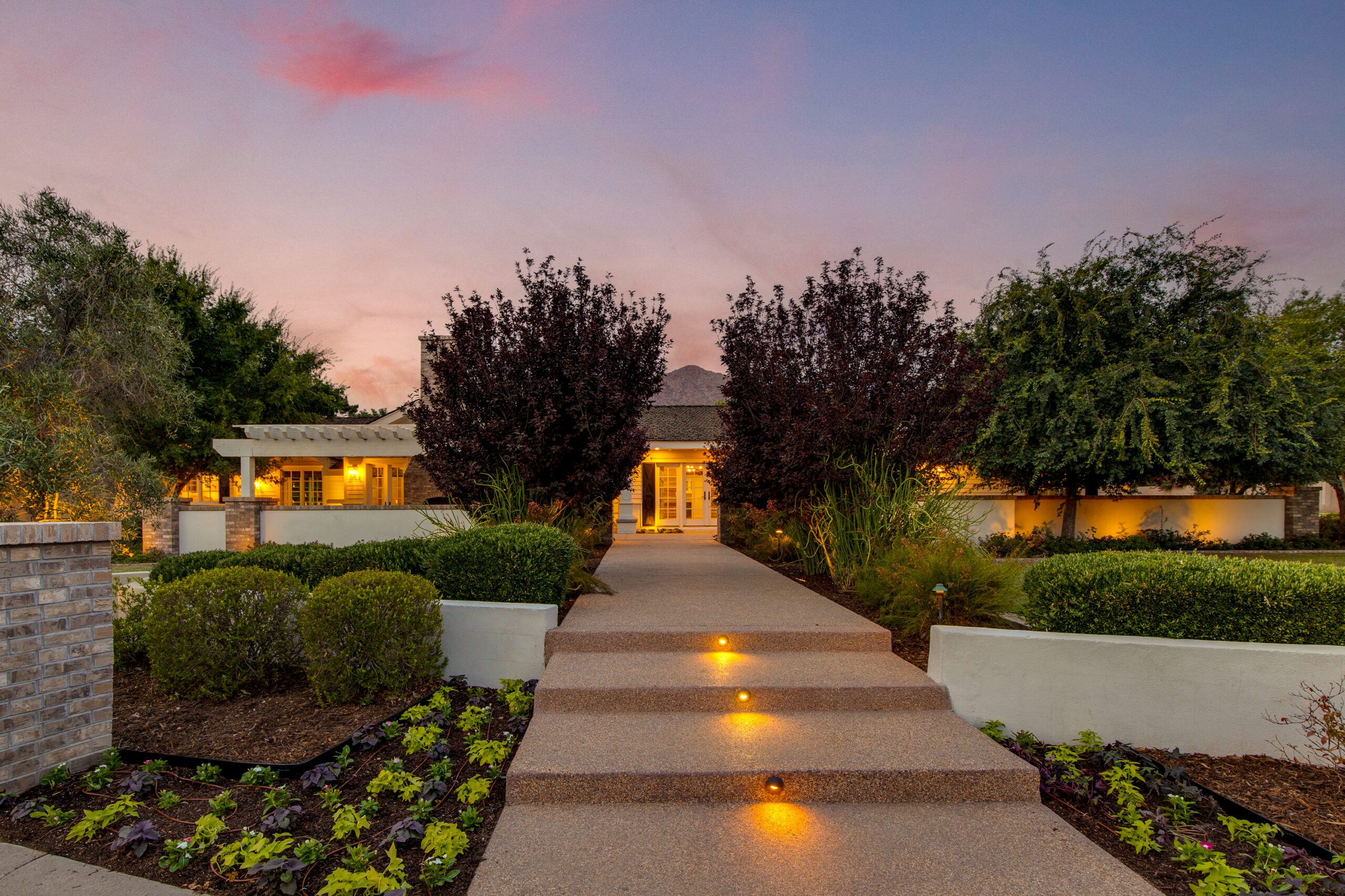 Remodeled in 2018, this stunning 6,100 sqft Arcadia Estate sits on a beautiful corner lot bursting with curb appeal with its lush landscaping and welcoming front porch pergola and classic red brick fireplace to greet guests. Thoughtfully designed, this split floor plan presents four spacious ensuite bedrooms including a primary suite designed with luxury and comfort in mind with a spa like bathroom featuring a stand alone tub, walk-in shower, double vanities and hand selected finishes throughout. The rest of the home includes a formal family room finished with wainscoting, a coffered ceiling and a cozy fireplace. In addition, enjoy a private home library with custom built-ins and a reading nook, and a spacious front room perfect for formal dining or a home office.