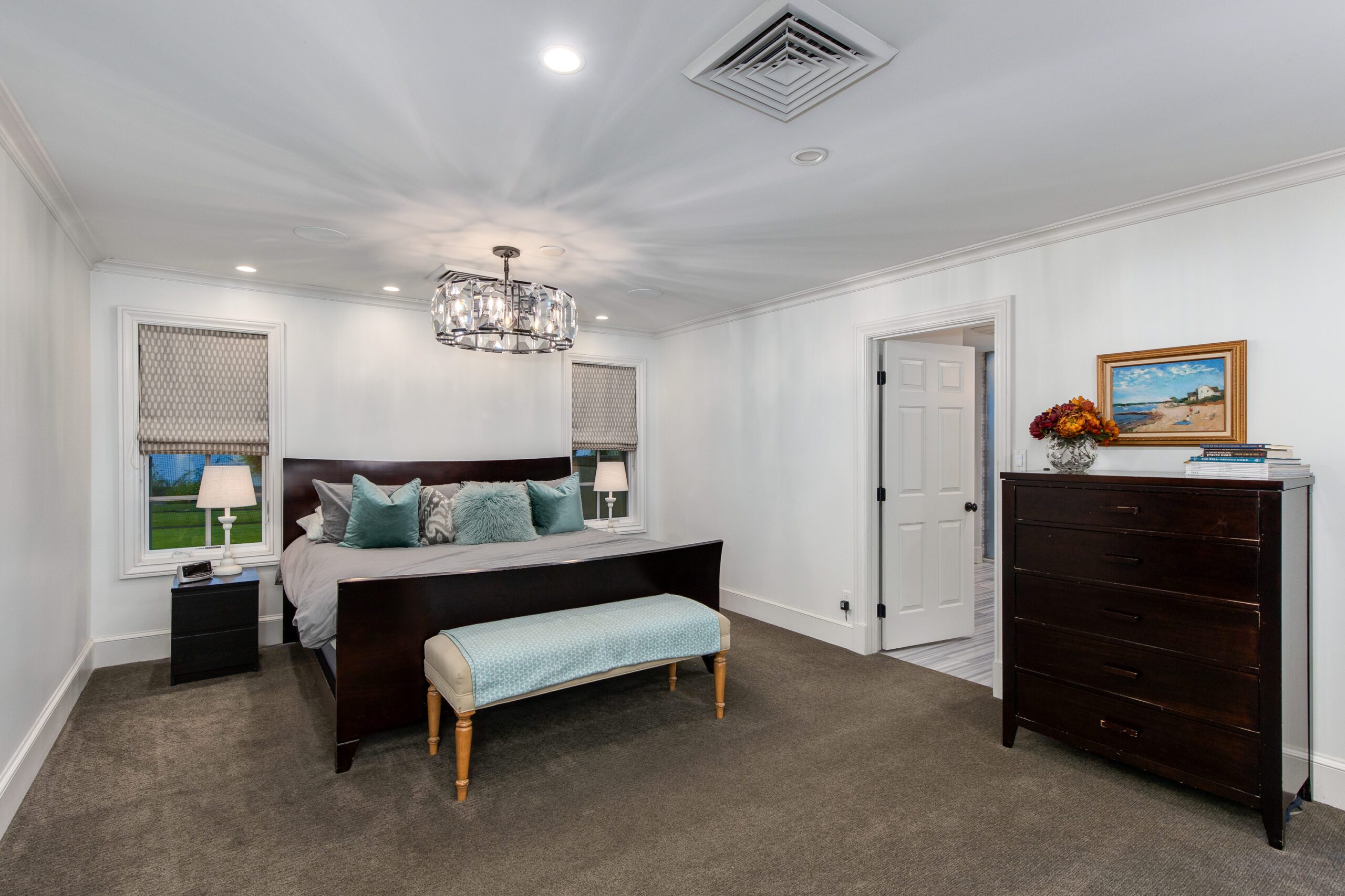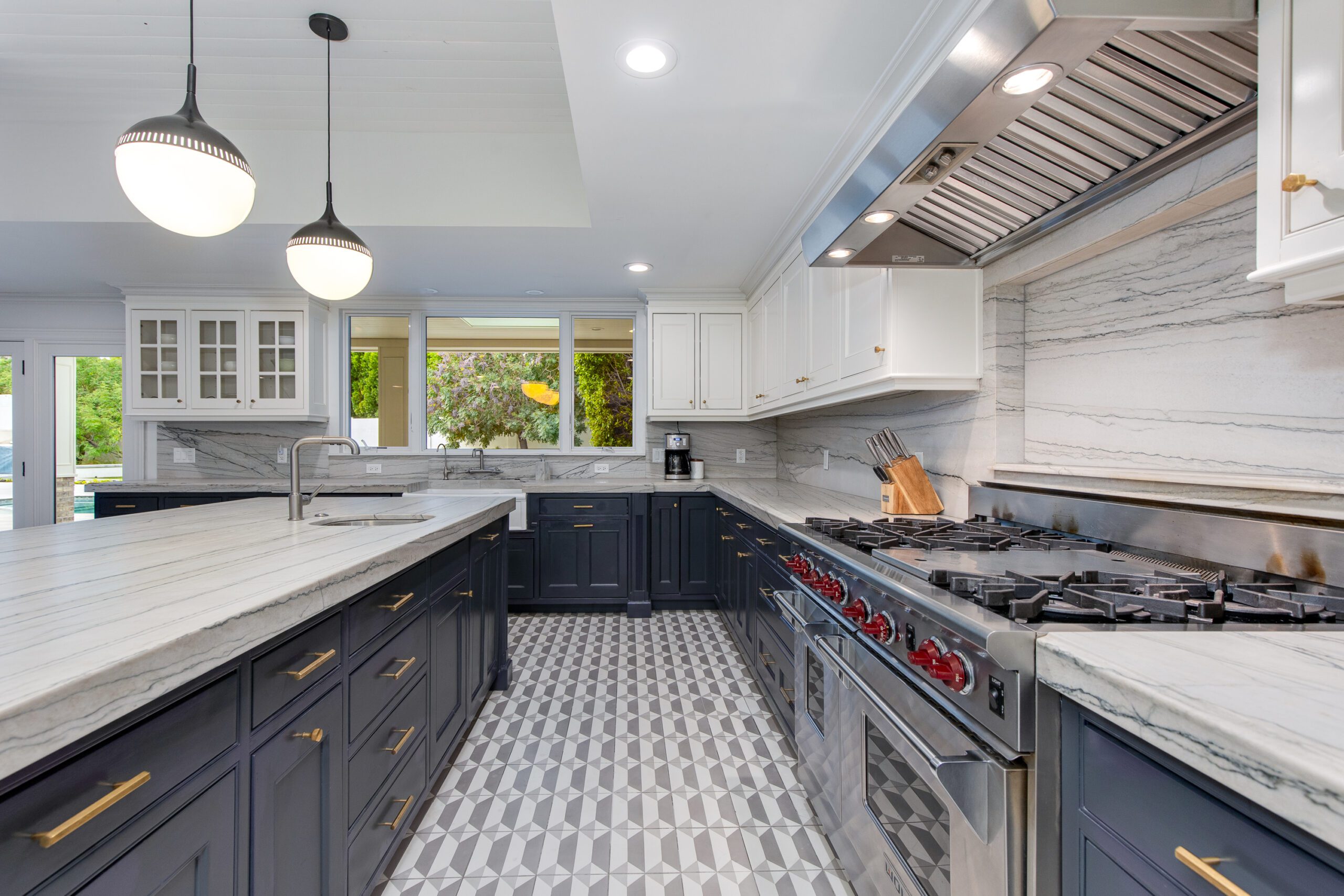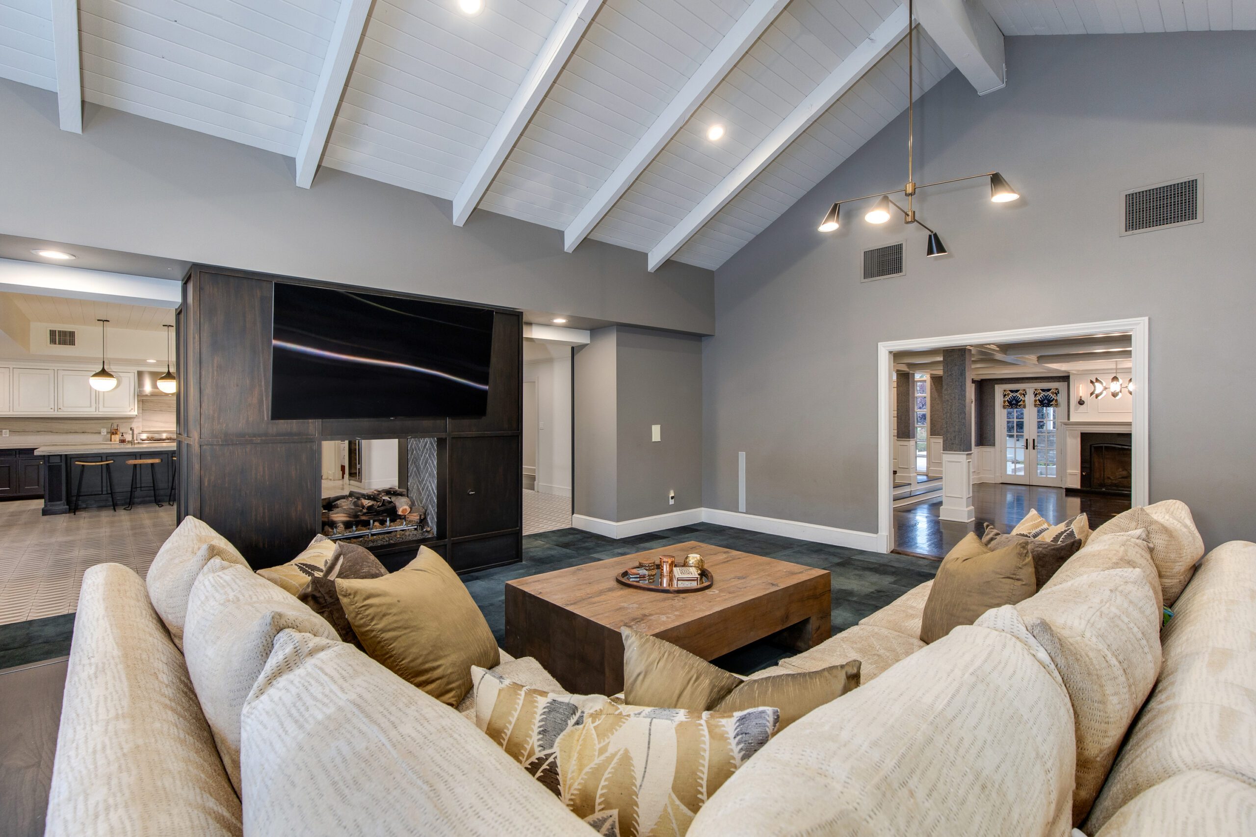 The butlers pantry, with a temperature controlled wine room, connects the formal dining to an oversized eat-in kitchen which is a testament to traditional elegance boasting marble countertops, a large kitchen island, and top-of-the line appliances including a Wolf Range and a Sub-Zero refrigerator/freezer. A passthrough fireplace seamlessly connects the kitchen to the home’s great room which includes a full bar and a stunning sliding door entrance to the backyard.