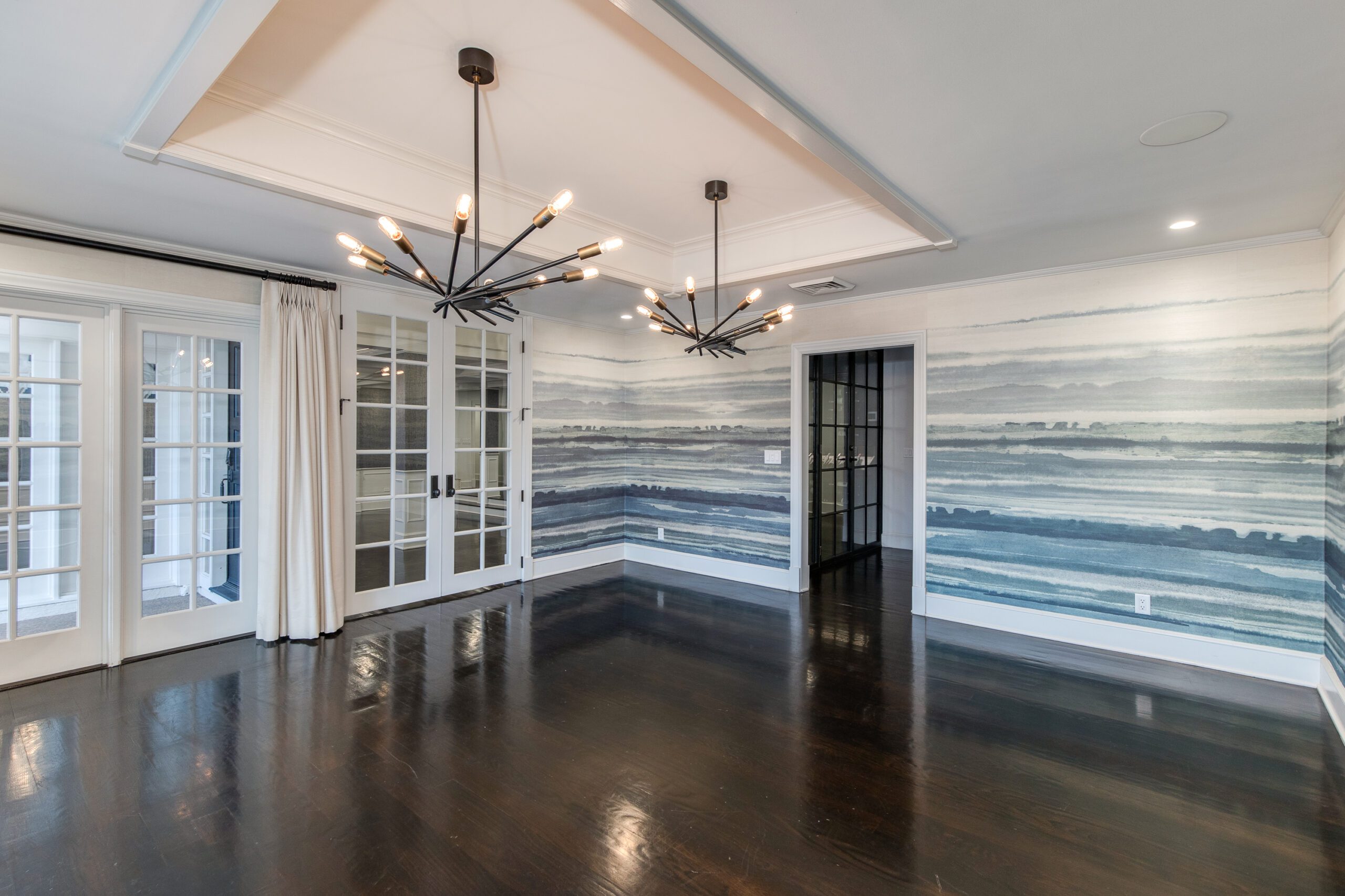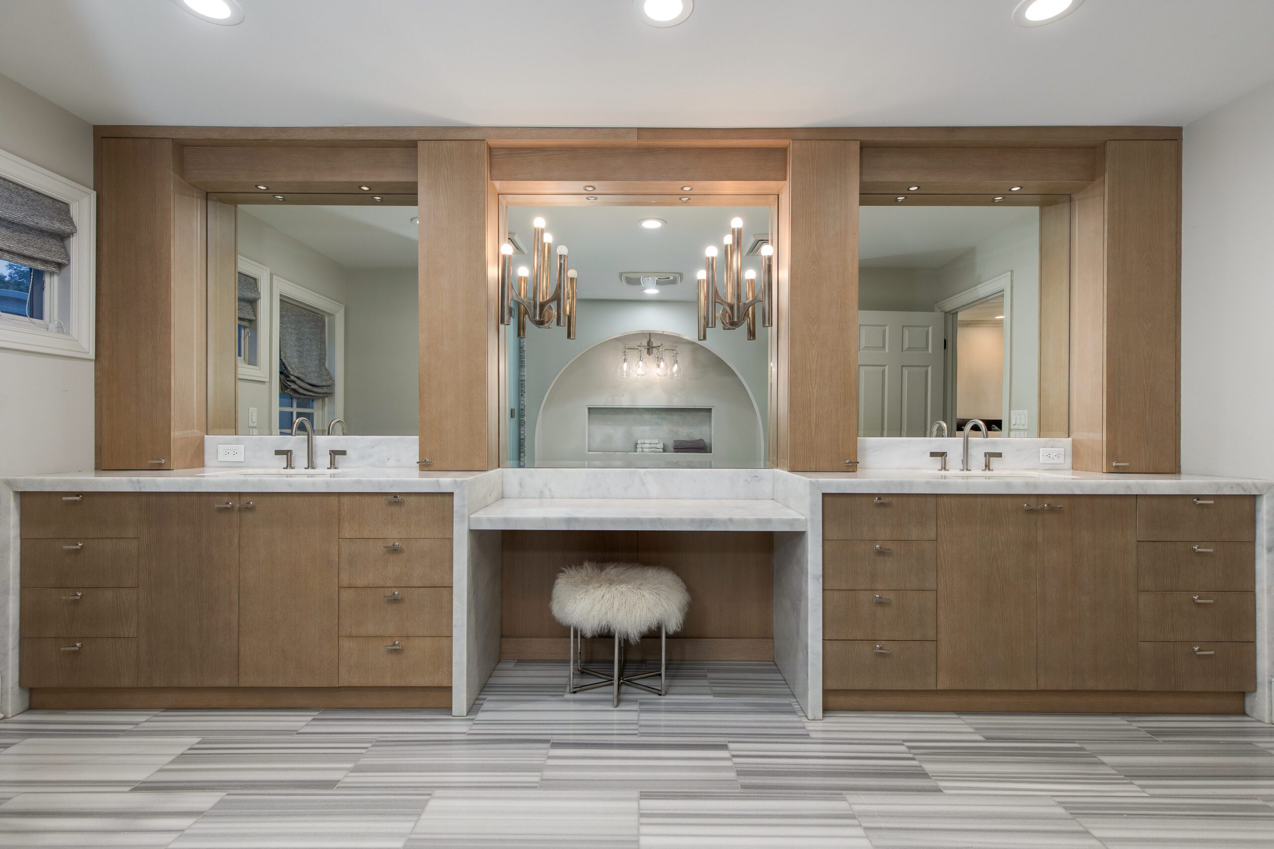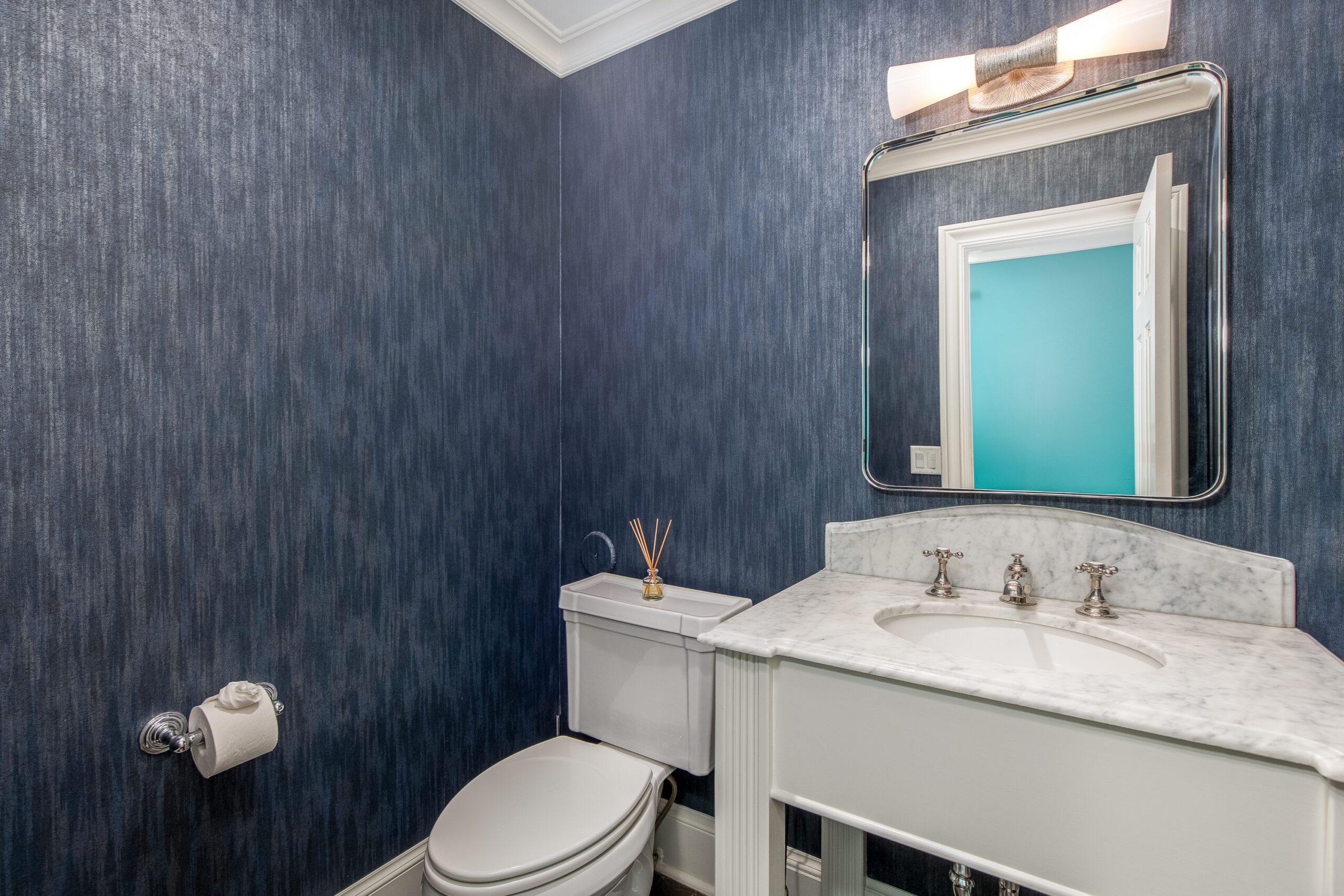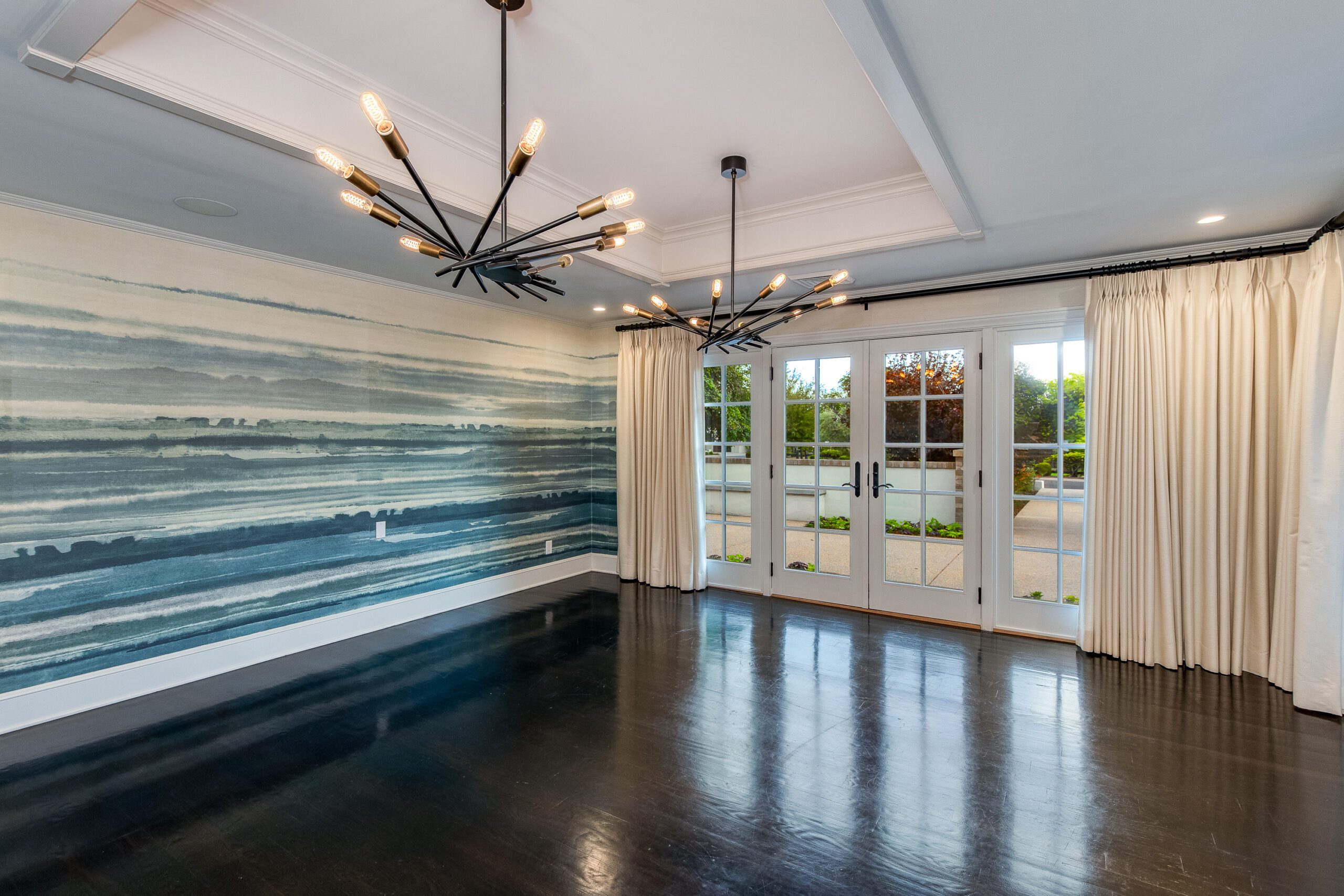 The butlers pantry, with a temperature controlled wine room, connects the formal dining to an oversized eat-in kitchen which is a testament to traditional elegance boasting marble countertops, a large kitchen island, and top-of-the line appliances including a Wolf Range and a Sub-Zero refrigerator/freezer. A passthrough fireplace seamlessly connects the kitchen to the home’s great room which includes a full bar and a stunning sliding door entrance to the backyard.