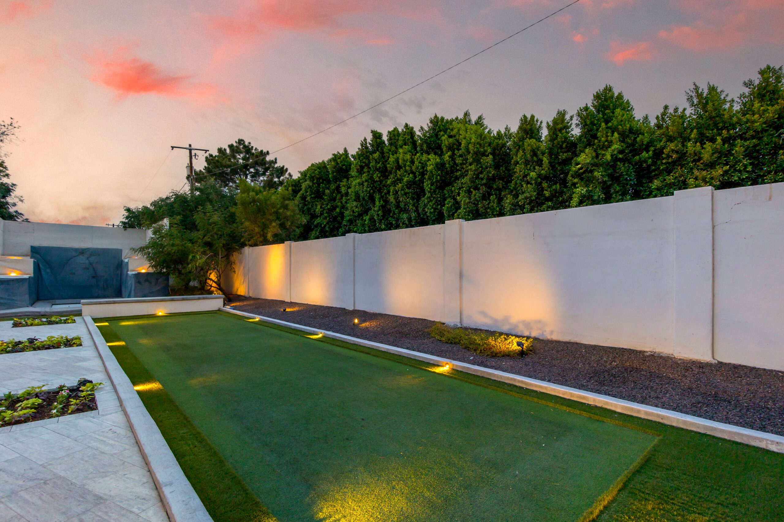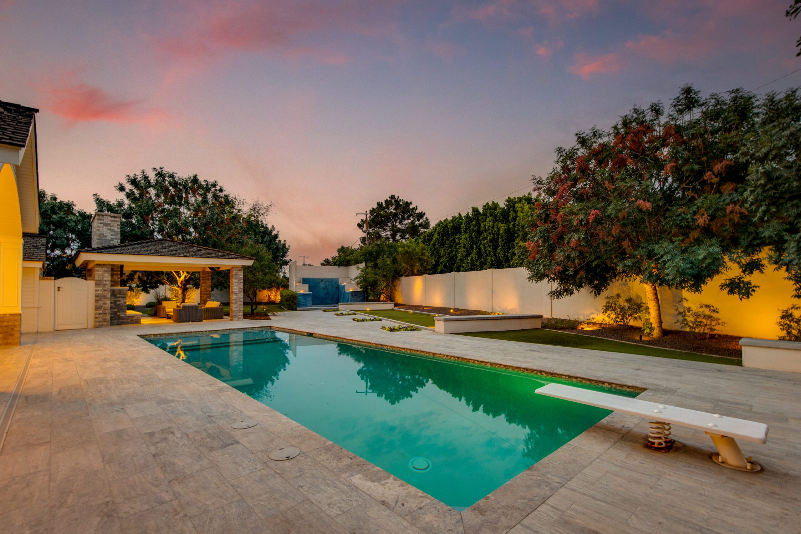 Designed for both relaxation and entertainment, the backyard retreat features lush landscaping, a diving pool that can be both heated and cooled, a built-in BBQ, and an elegant covered ramada that houses an outdoor fireplace creating a cozy ambiance for evening conversations and gatherings. To top it off, all your family and friends can have fun enjoying the in-ground trampoline, bocce ball court and a professional batting cage.